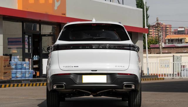 车身侧面相对比较常规,隐藏式的门把手个人认为在实用性方面不如传统门把手,何况还是燃油车。B柱和C柱进行了熏黑处理,车窗周围加入了一圈银色饰条点缀,车门下方的腰线很有层次感,配备上18英寸的铝合金轮毂,看起来还是很有气势的。车尾则采用贯穿式的尾灯,内部熏黑处理后看起来更有档次,上方是奇瑞的字母标识,配备上大尺寸双边双出的排气以及尺寸不算很大的尾翼。因此总体来看,瑞虎8 PLUS不管是颜值还是整车的气势以及高级感的营造方面,显然要强于小弟瑞虎8。